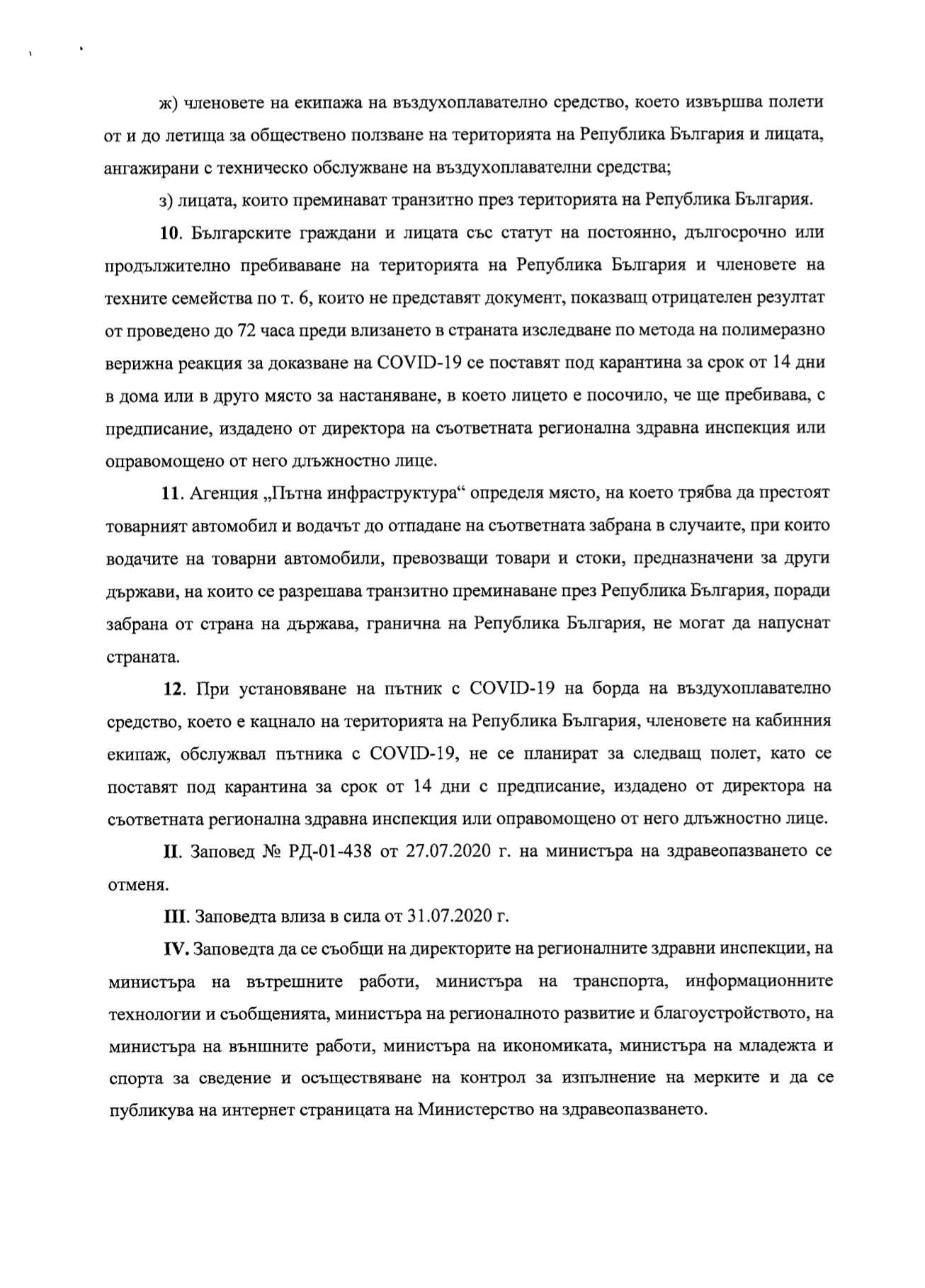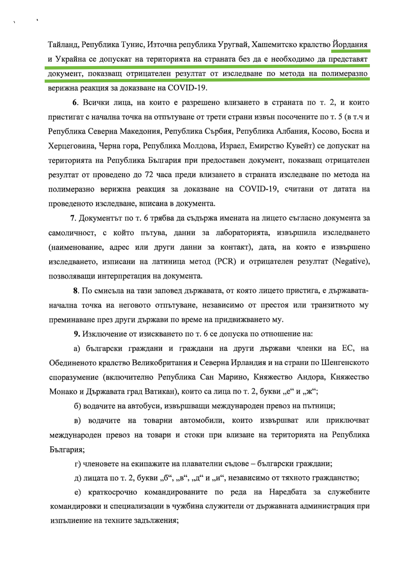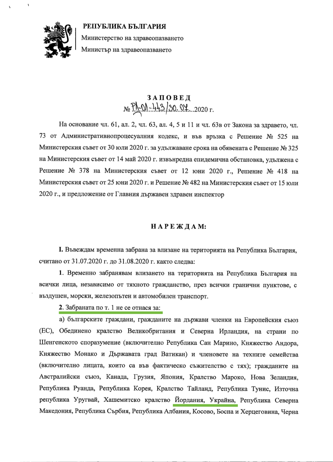 Minister of Health Kostadin Angelov today issued an order "Zapoved RD-01-443/30.07.2020" from which it follows that starting from July 31, citizens of Ukraine and Jordan can enter the territory of Bulgaria without providing a negative PCR test result.