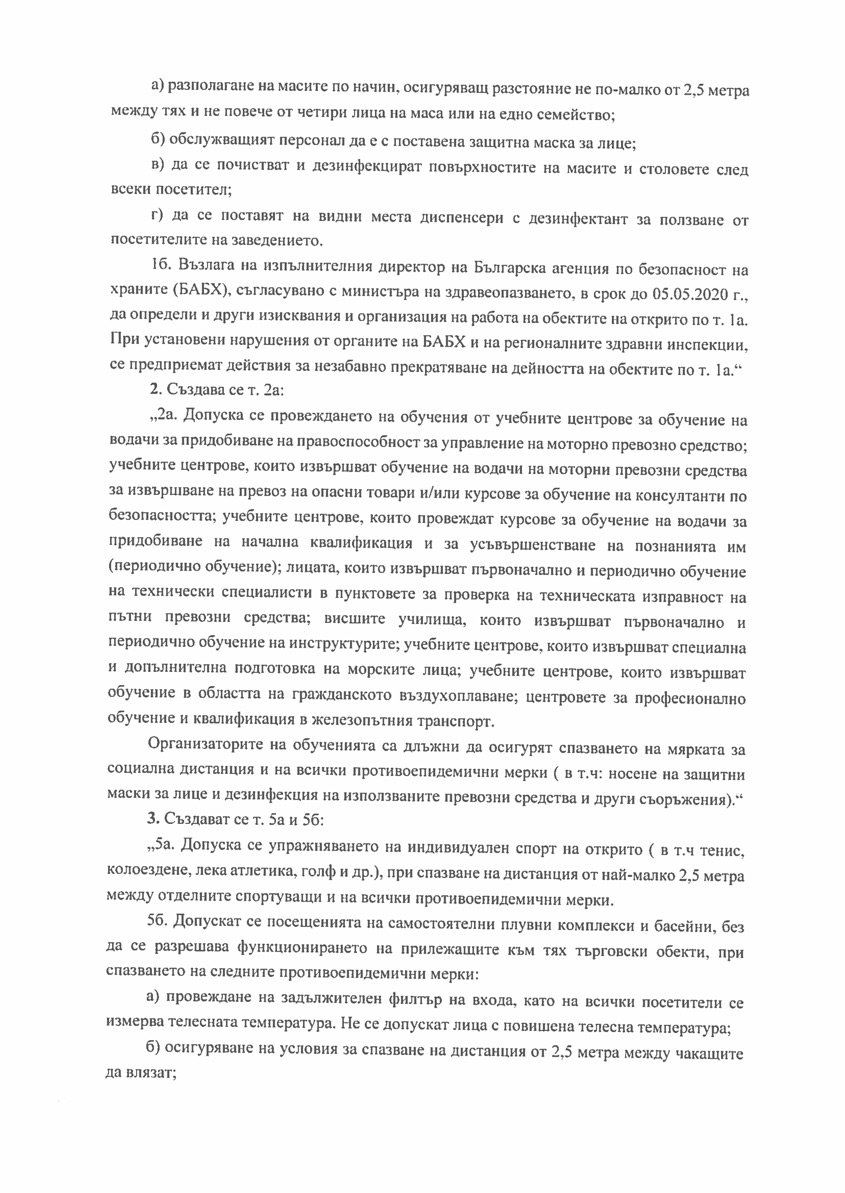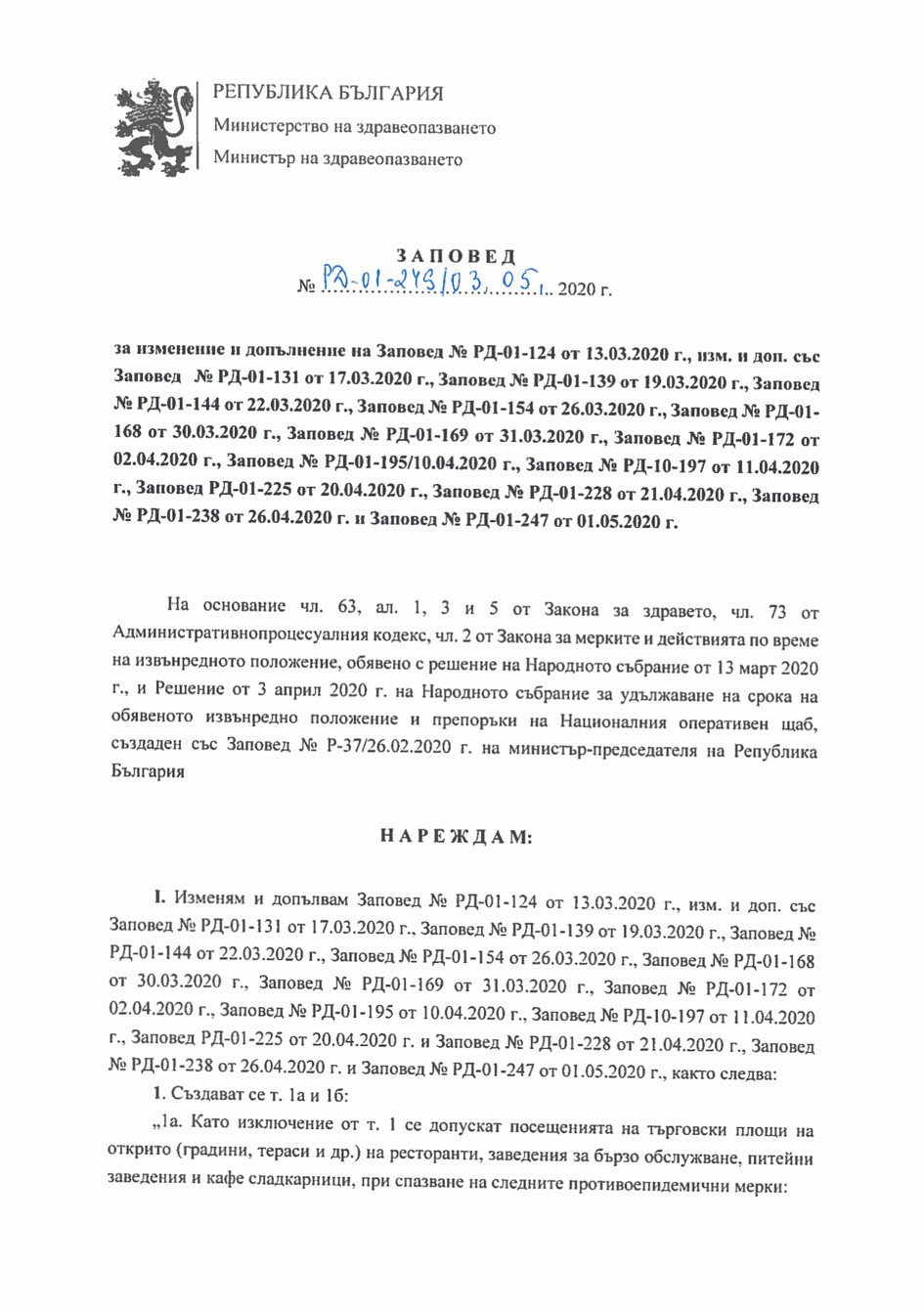 On Sunday, May 3, 2020, Bulgarian Health Minister Kiril Ananiev issued an order (Reserve No. RD-01-249/05/03/2020), canceling some anti-epidemic measures and allowing the opening and visiting of outdoor trading areas. These are terraces of cafes, restaurants, fast food establishments and bars. They will be able to start working on May 6, subject to the following anti-epidemic measures:
