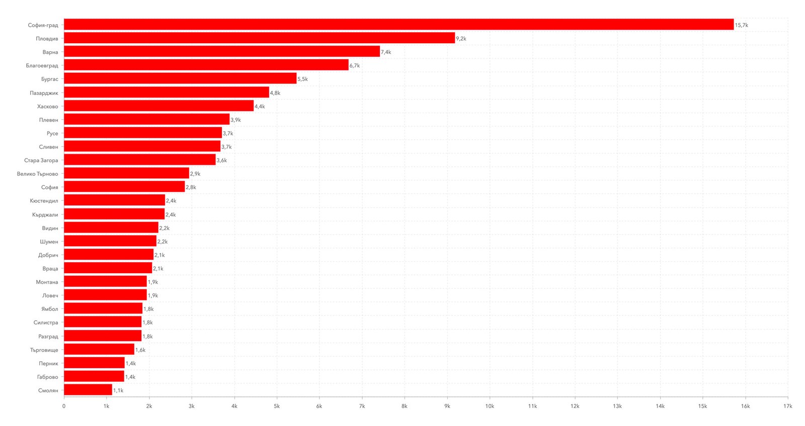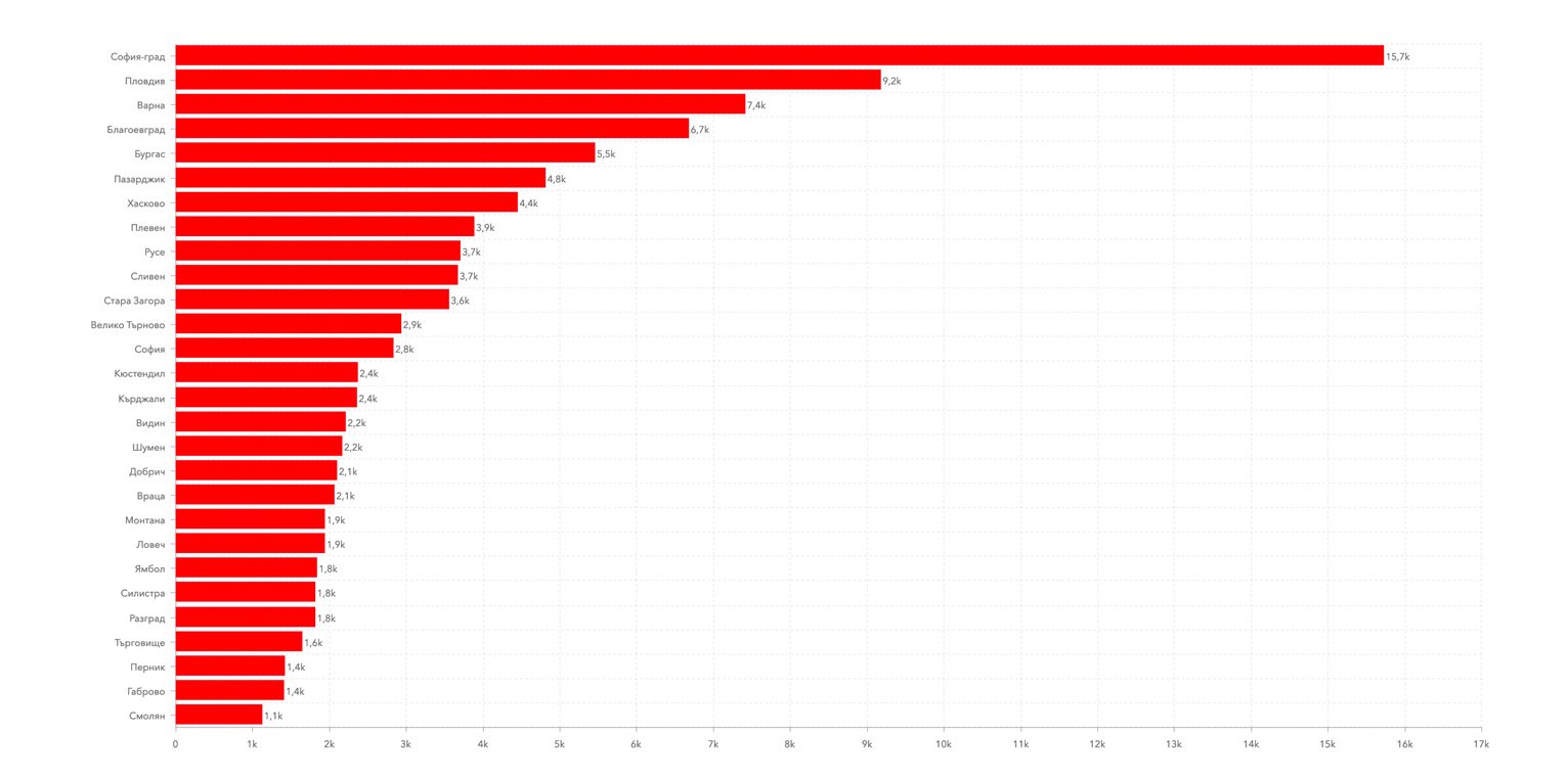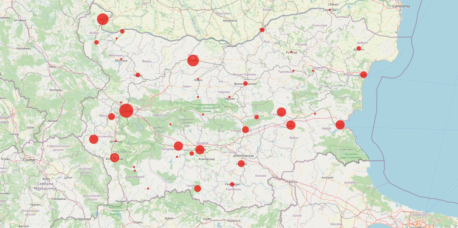 Number of COVID-19 infections on the map of Bulgaria. Data: Johns Hopkins University