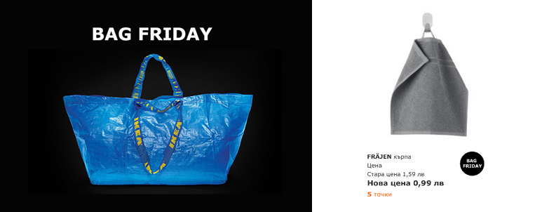 С 23 по 25 ноября магазин готовой шведской мебели и аксессуаров для дома IKEA проводит акцию под названием «Bag Friday». Ключевым имиджем акции стала известная всем синяя сумка для покупок. Компания анонсировала скидки достигающие 60%. К сожалению список товаров совсем небольшой, всего 34 наименования, среди которых диван из серии VIMLE, наволочки SOMMAR и SKOGSNAVA, полотенца FRÄJEN, несколько вдов стульев, три осветительных прибора, кашпо, рамка для фото, несколько аксессуаров для украшения интерьера. Создаётся впечатление, что акция носит скорее номинальный характер, чем даёт возможность приобрести нечто полезное со скидкой.