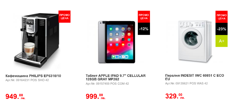 Технополис и Техномаокет — две крупнейших сети магазинов электроники и техники для дома в Болгарии, в этом году также участвуют в распродажах. Компания Техномарокет предлагает три варианта скидочных акций: 17-25 ноября «BlackOUT», 8-39 ноября «70%», 1-30 ноября «50%». На веб-сайте магазина выделен отдельный раздел в котором представлено около 500 наименований товаров со скидками, есть удобная сортировка по типу и цене. К примеру мобильный телефон Apple iPhone X 64GB можно приобрести со скидкой 15% (1800 лв), холодильник NEO за 280 лв, а стиральную машинку indesit со скидкой 23% (330 лв.). Несмотря на название акции, товары со скидкой более чем 41% (а уж тем более 70%) в списке товаров мы не обнаружили.