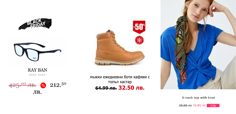 Всемирно известные бренды одежды, такие как H&M (20% только 24 ноября), Bershka (до 50%), Forever21 (до 30%), Pull&bear (20% 24-25 ноября), Mango (30%), NewYorker (до 50%), Benetton (20% только 24-25 ноября), Levi’s (30%) и многие другие также принимают участие в акции. До 50% скидок предлагает спортивная марка Adidas. Сеть магазинов косметики и бытовой химии DM также участвует в акции — 20% только 23-24 ноября. Магазины парфюмерии более высокой ценовой категории Yves Rocher, Sephora, BodyShop, Douglas Rivoli не дают скидок именно на территории Болгарии. Магазин Refan, известный продукцией из масличной розы, также остался в стороне.