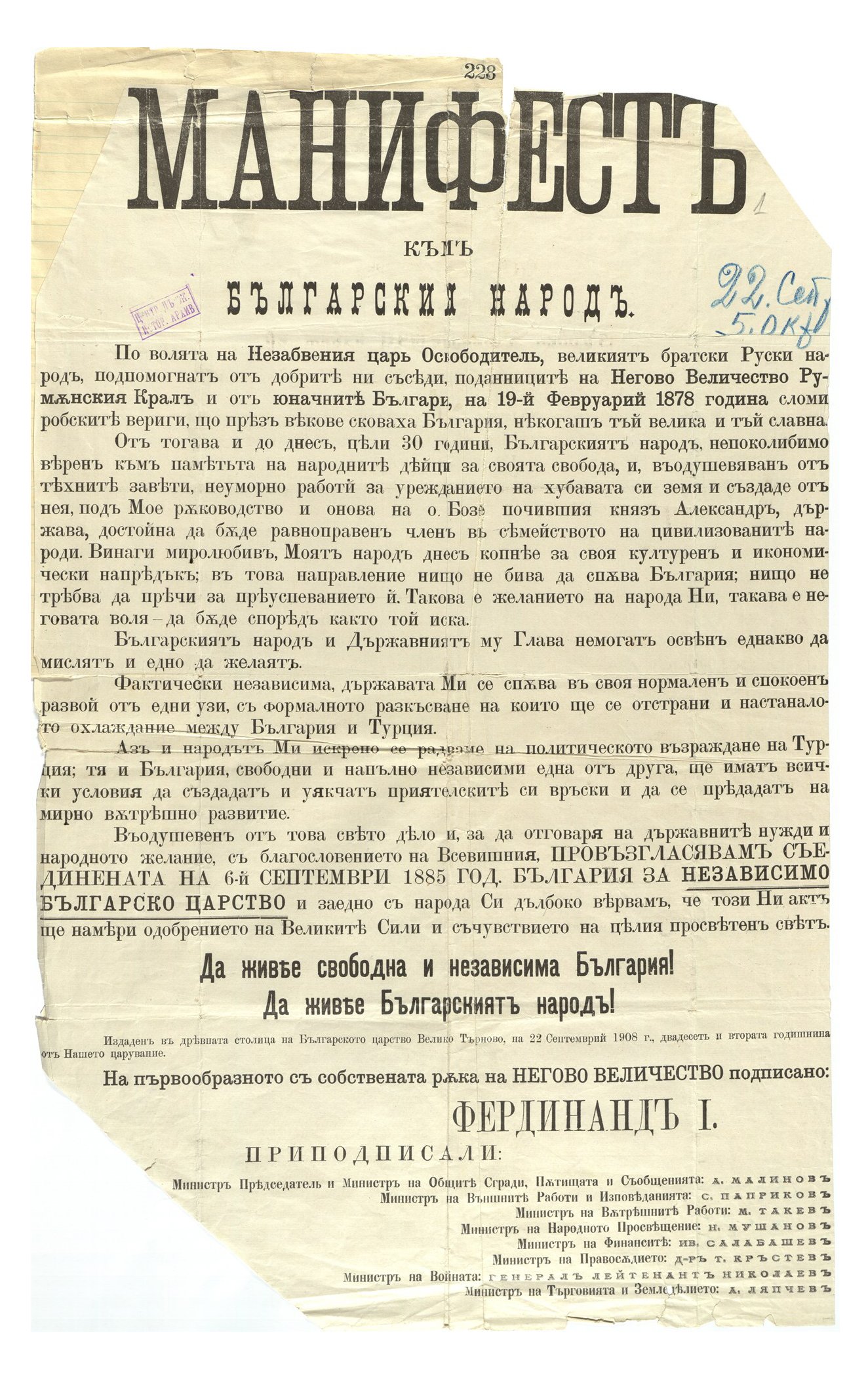 И вот 22 сентября 1908 года князь Фердинанд обнародовал манифест о провозглашении независимости Болгарии. Место для этого события было выбрано не случайно – город Велико-Тырново является старой столицей страны. Также было объявлено об учреждении Болгарского царства, главой которого стал получивший корону Фердинанд. Как и следовало ожидать, Османская империя оказалась далеко не в восторге от действий своих вчерашних вассалов. Однако, возможности начать немедленное вторжение у Порты уже не было. Зато Болгария объявила о готовности защищать свою свободу при помощи оружия. В этот момент мировые державы настояли на проведении переговоров между Болгарским царством и Османской империей.